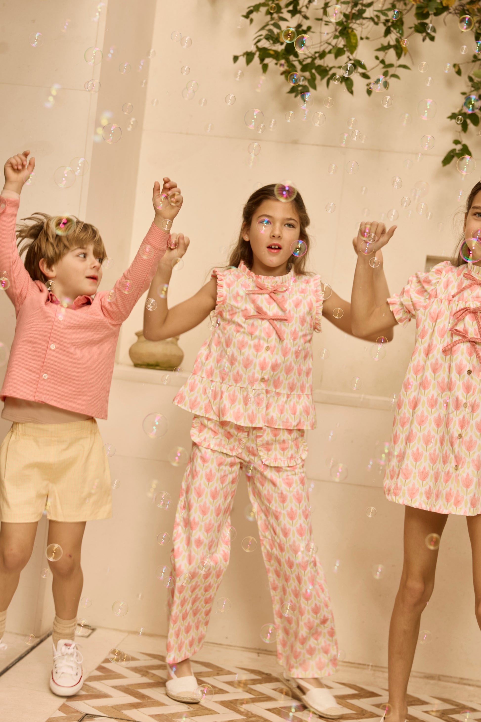 Conjunto infantil de dos piezas; blusa y pantalón largo confeccionado en tejido suave y ligero. Diseñado para crear un look armonioso y para poder coordinar entre hermanos. Tiene unos lazos decorativos a contraste hechos con tejido vichy y el pantalón tiene bolsillos
